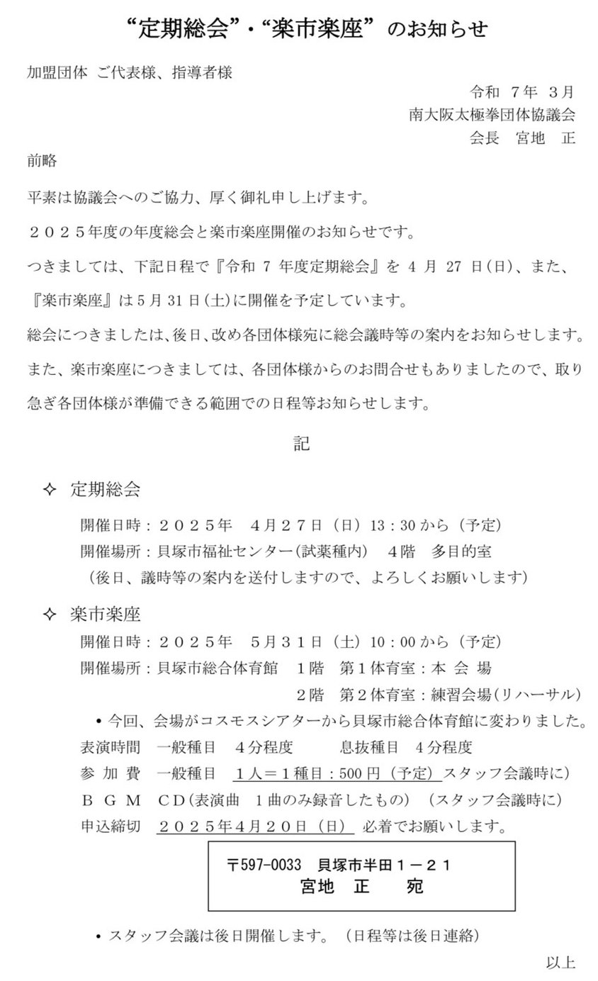 ● 4月13日(日) 総会10時 ~ 表演会12時30分開始